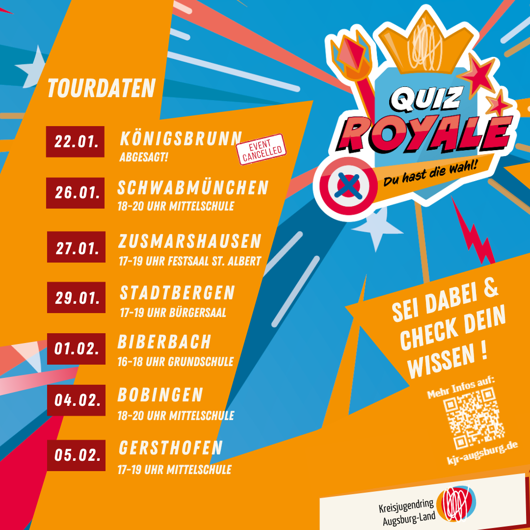 Zu folgenden Terminen wird Quiz Royale mit ausgewählten nominierten Bürgermeister-, Landrats-, und Stadtrats-Kandidat*innen 2026 auftreten:
